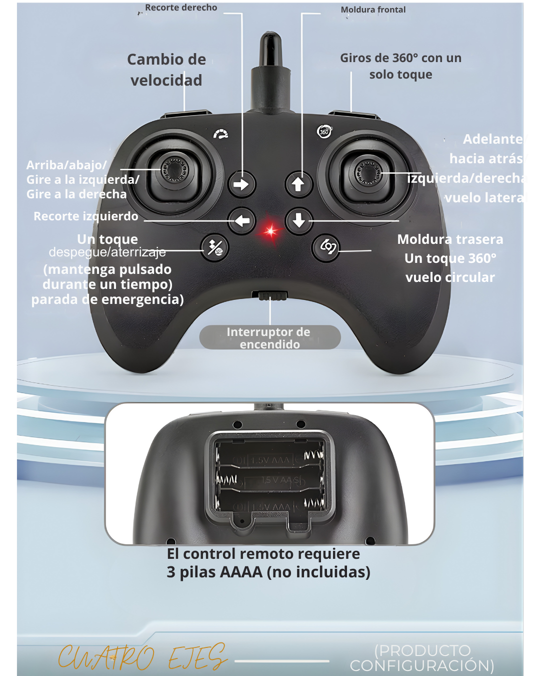 - Trims (ajuste fino) para corregir deriva izquierda/derecha y adelante/atrás.