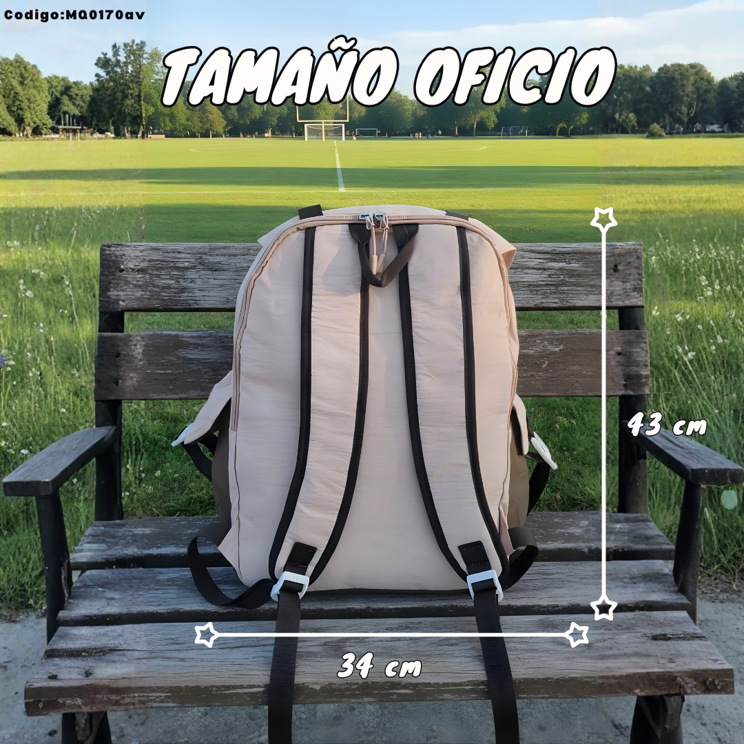 Mochila escolar y de uso diario en tamaño OFICIO, ideal para cuadernos grandes por sus medidas 43×34 cm. Diseño con tapa (flap) y correas, más bolsillos frontales y laterales para organizar mejor.