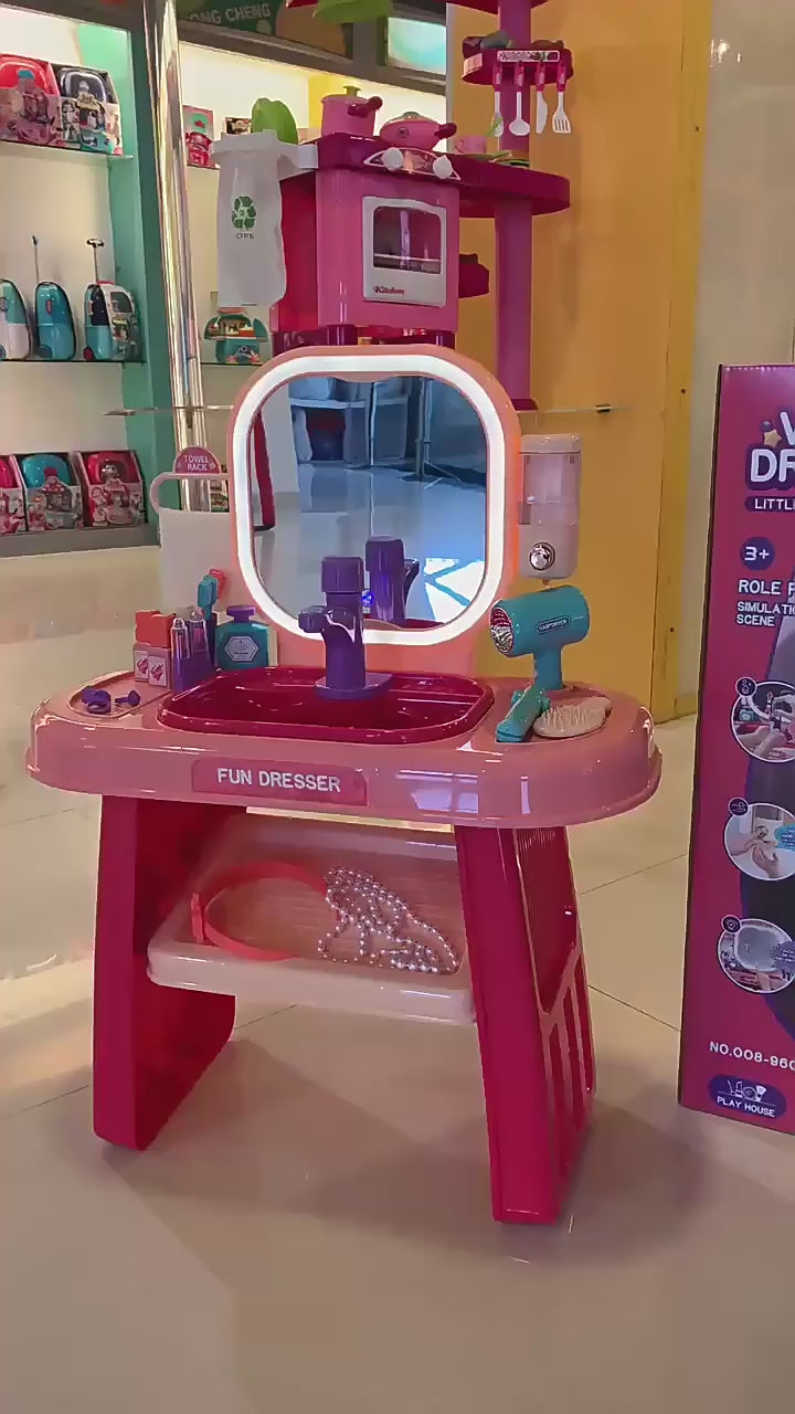Convierte la hora de juego en un momento mágico con este tocador infantil multifuncional, diseñado para estimular la creatividad, el juego simbólico y el desarrollo de habilidades motrices en niñas de 3 a 8 años.